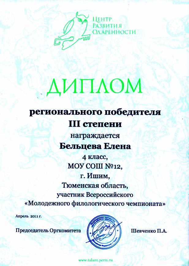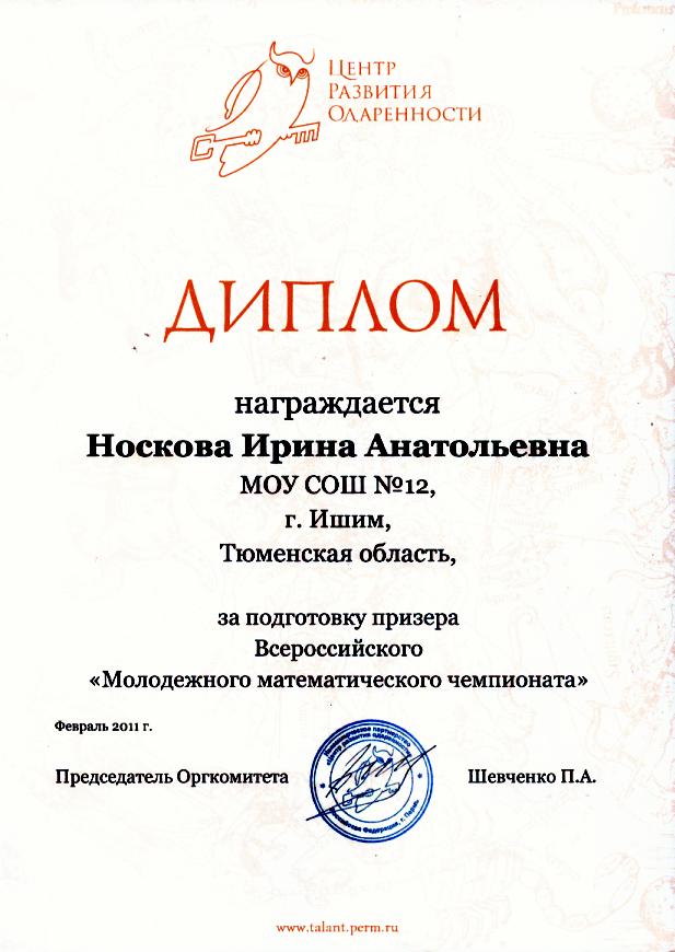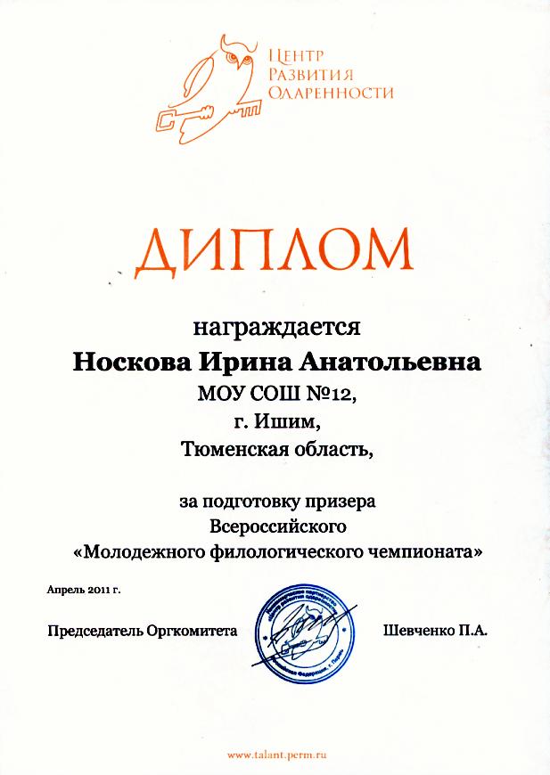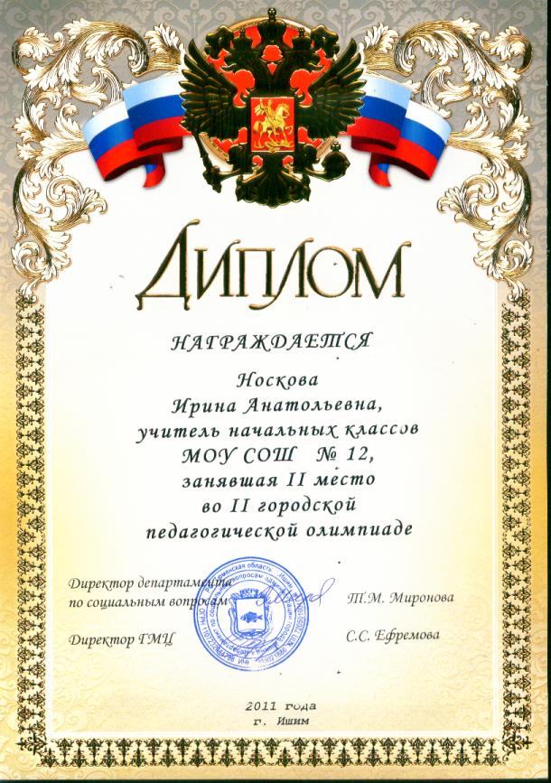 Образование: Ишимский государственный педагогический институт (1992 г.) Специальность: "Педагогика и методика начального обучения" Стаж: 18 лет Сведения о повышении квалификации: ИГПИ, «Организация образовательного процесса в начальных классах в соответствии с федеральными образовательными стандартами начального общего образования» (2010 г.) Достижения учителя: Учитель начальных классов первой категории (2009 г.). Финалист Всероссийского конкурса профессионального мастерства педагогов "Мой лучший урок", посвященного «Году Учителя» в России (2010 г.), II место на Второй городской олимпиаде педагогов дошкольного и начального образования (2011 г.)